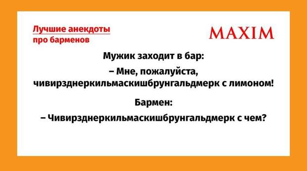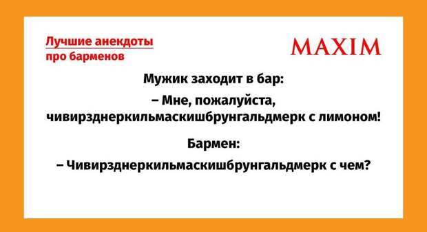 Мужик заходит в бар: — Мне, пожалуйста, чивирзднеркильмаскишбрунгальдмерк с лимоном! Бармен: — Чивирзднеркильмаскишбрунгальдмерк с чем?