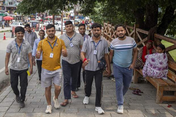 Индийские туристы идут по улице популярного курортного города в Гималаях