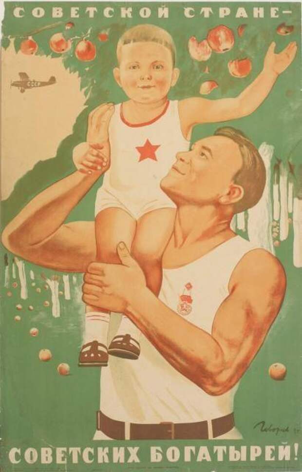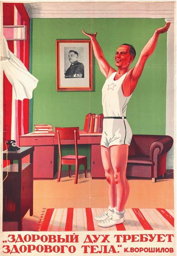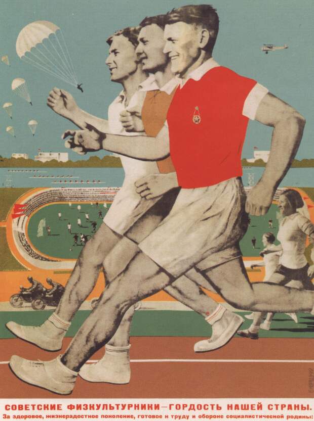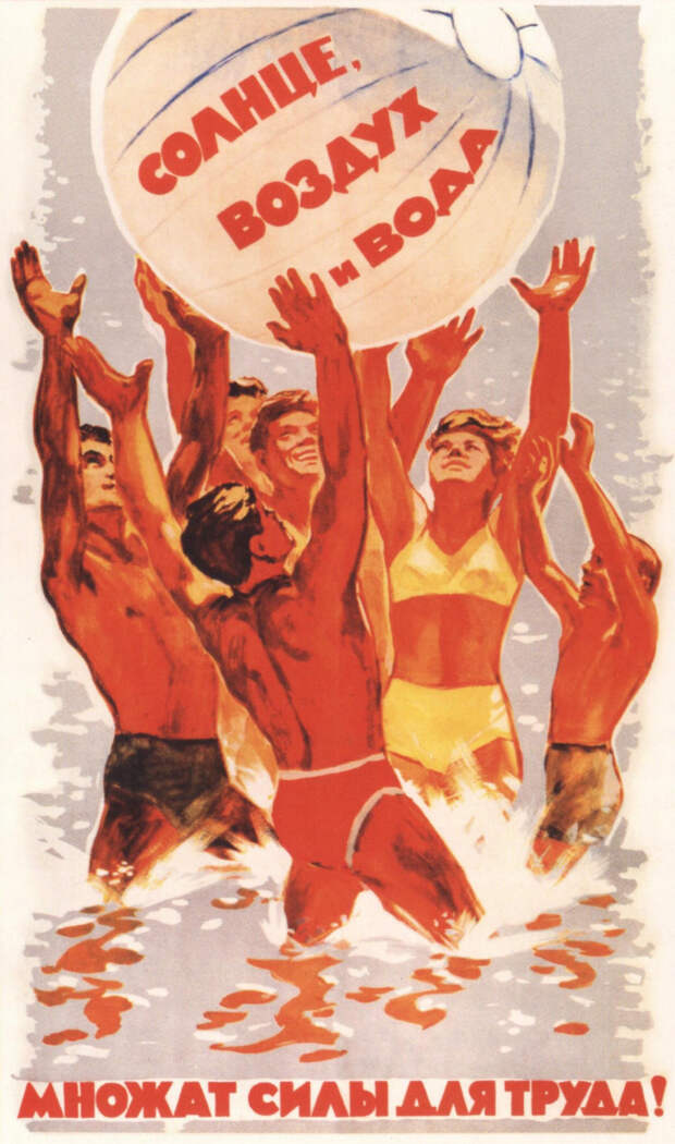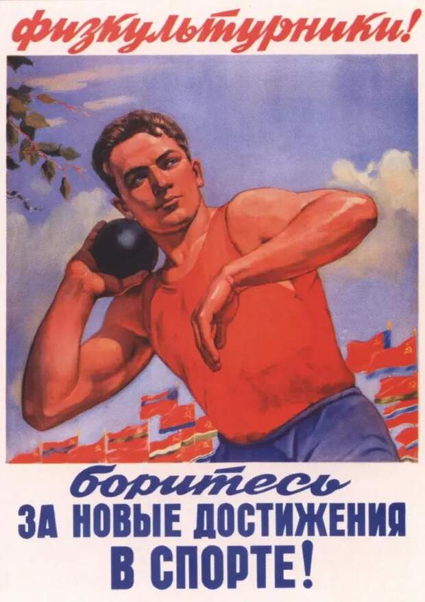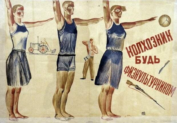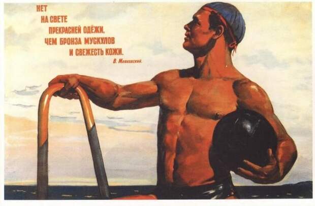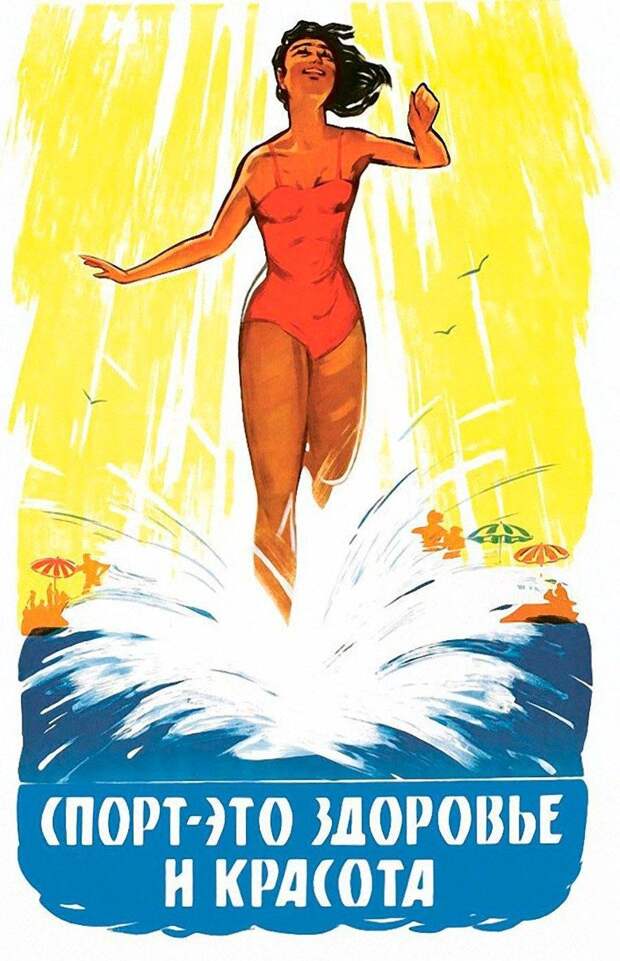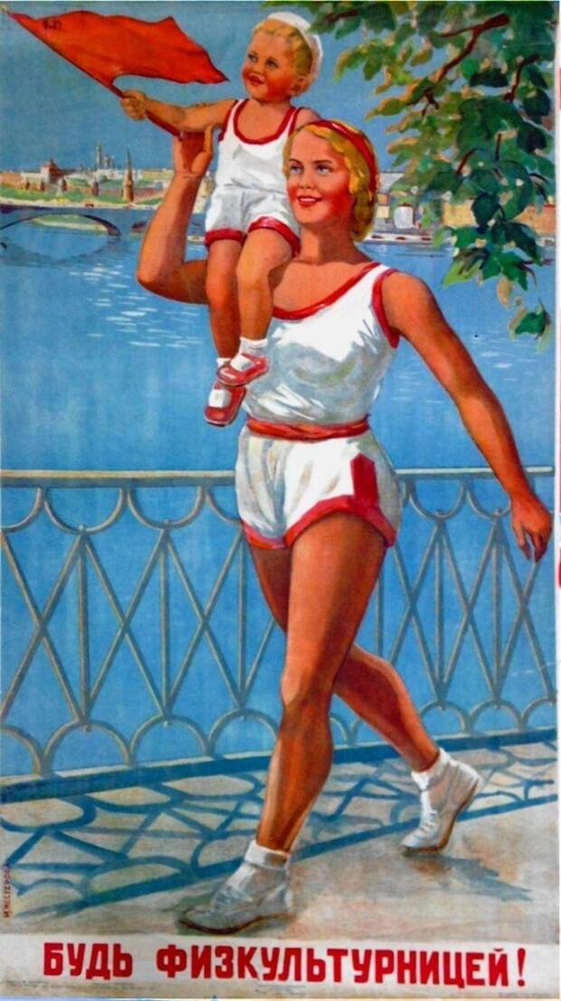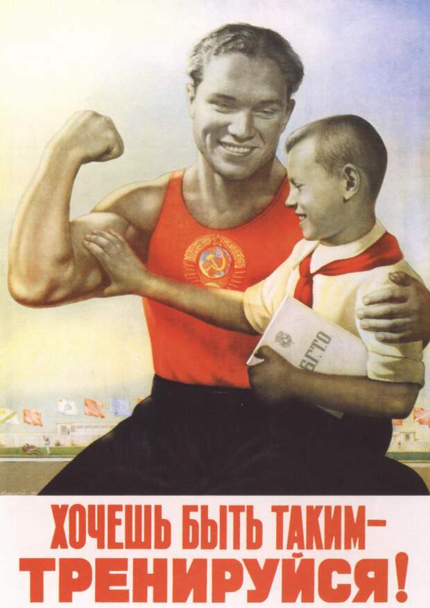 Советские плакаты про пользу физической культуры для трудящихся масс показывали этим самым массам идеалы, к которым следует стремиться, — сверкающих мускулами и белозубыми улыбками юных атлетов и атлеток.