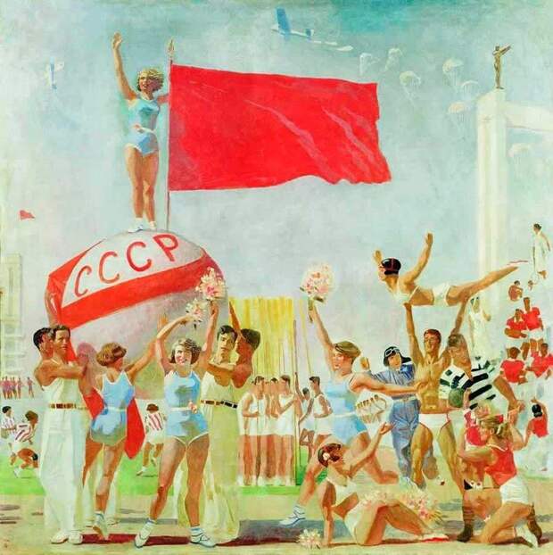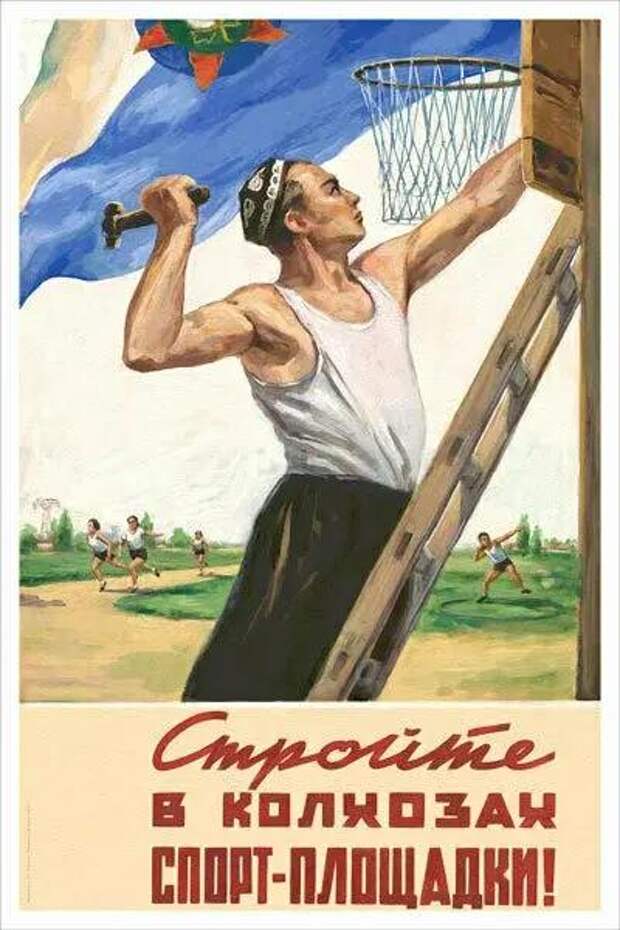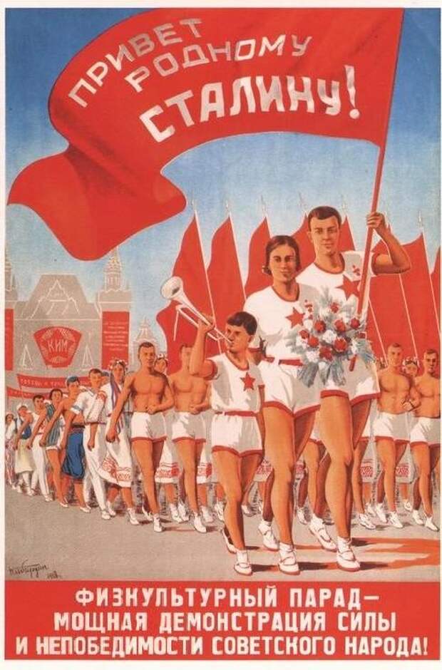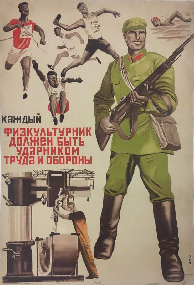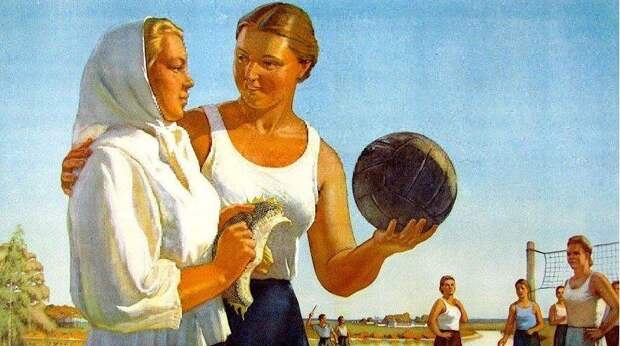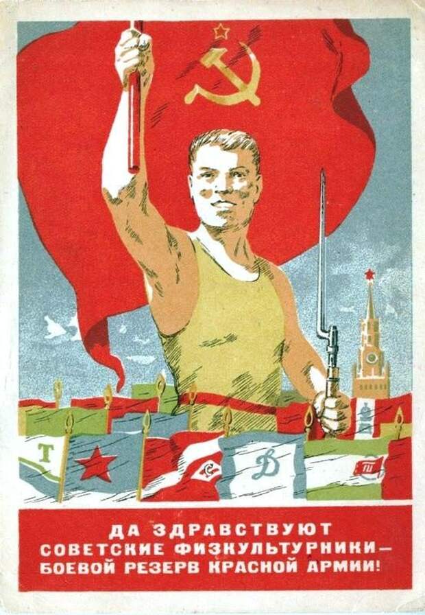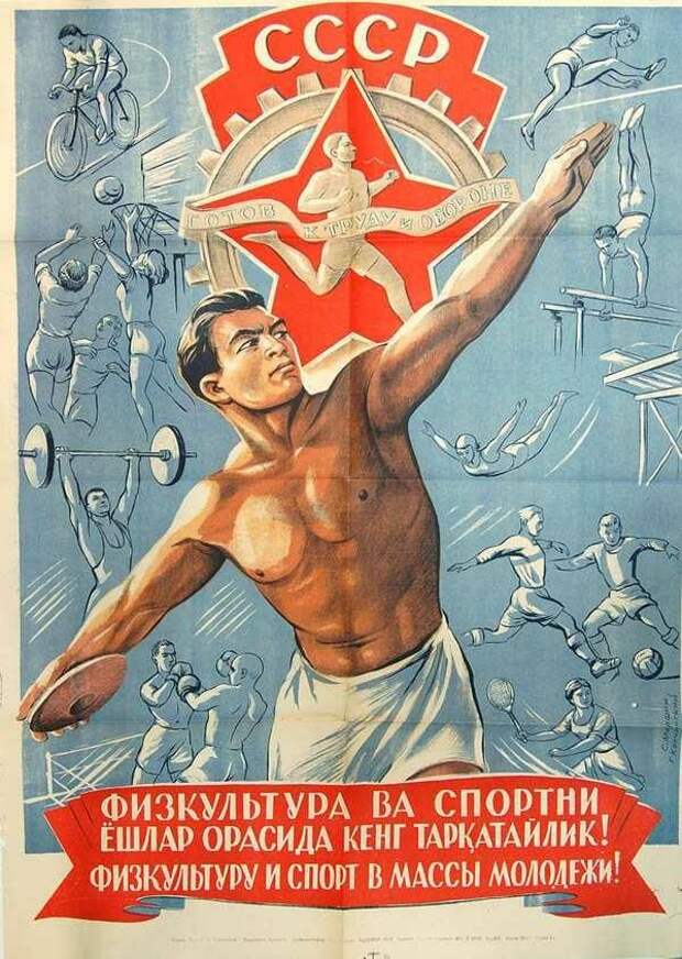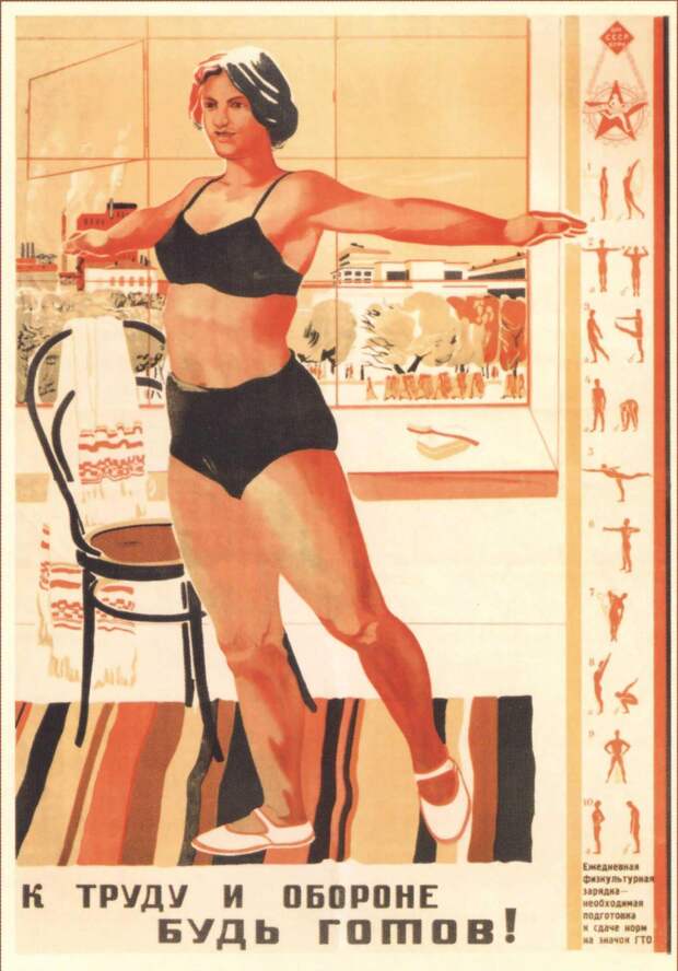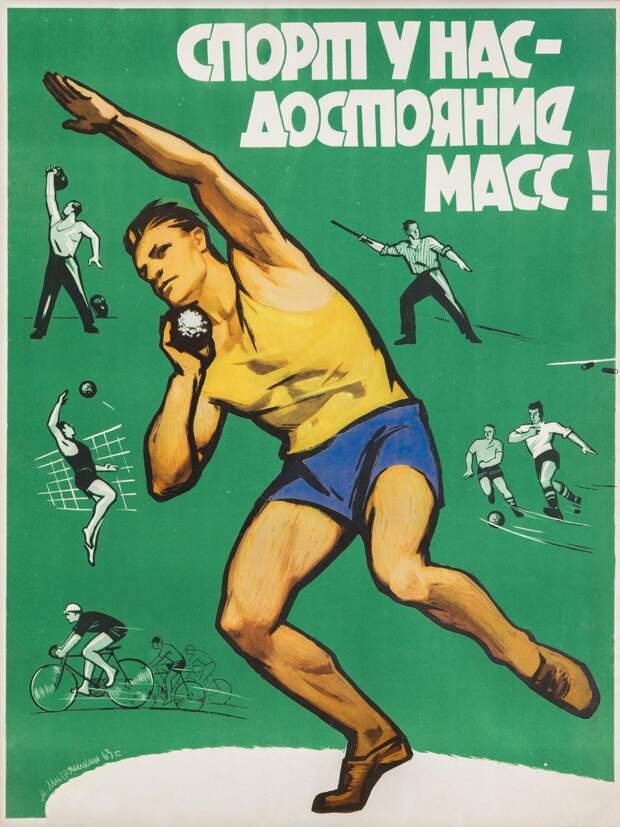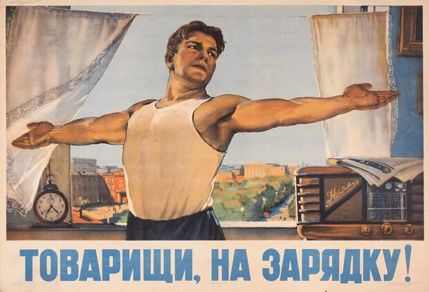 Советские плакаты про пользу физической культуры для трудящихся масс показывали этим самым массам идеалы, к которым следует стремиться, — сверкающих мускулами и белозубыми улыбками юных атлетов и атлеток.