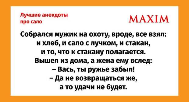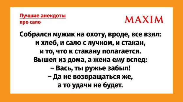 Но такой повод не грех отметить дважды! Для пущего настроения MAXIM собрал для вас самые смешные анекдоты про сало.Продает грузин на рынке сало. Подходит мужик, отрезал и попробовал: — М-м-м, какое вкусное! Чем свинью кормил? — Хлэбом кормил! — с гордостью отвечает грузин. Мужик достает корочку ОБХСС: — Хлебом кормить нельзя, штраф. Отдал грузин штраф, стоит злой на всех. Подходит другой мужик. Отрезает сало. Пробует: — М-м-м, какое вкусное сало! Чем свинью кормил? Грузин со злостью: — Сэном кормил! Мужик достает корочку работника санэпидемстанции: — Сеном кормить свиней нельзя, платите штраф. Отдал грузин деньги, еще злее стал. Подходит третий мужик, пробует сало: — М-м-м, какое вкусное сало. Чем свинью кормил? — Чем кармил, чем кармил… Ничем не кармил! Дэньги давал, а он сам кушать хадыл!