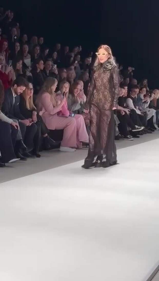 Орнелла Мути за проходкой дочери наблюдала из первого ряда — в сильно декольтированном бордовом платье. Происходящее она снимала на смартфон.