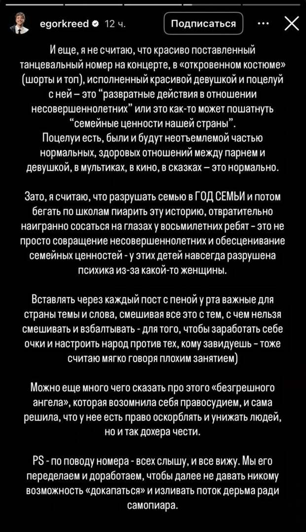 Ранее в сети распространились ролики с концерта Егора Крида, во время которого он трогал танцовщиц, одетых в короткие шорты и топы, за мягкие места, а одну из танцовщиц страстно поцеловал на глазах у 86 тысяч зрителей.