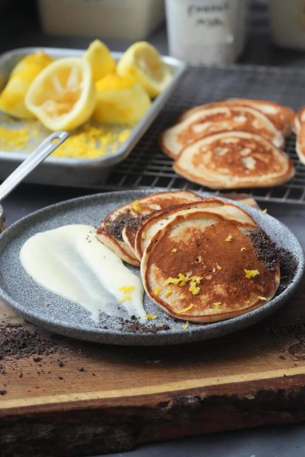 1. Смешать все виды муки, разрыхлитель и кукурузный крахмал. Взбить яйца с солью и сахаром, затем добавить к ним теплое молоко. Вмешать все жидкие компоненты к сухим постепенно. Добавить цедру лайма и растопленное сливочное масло.