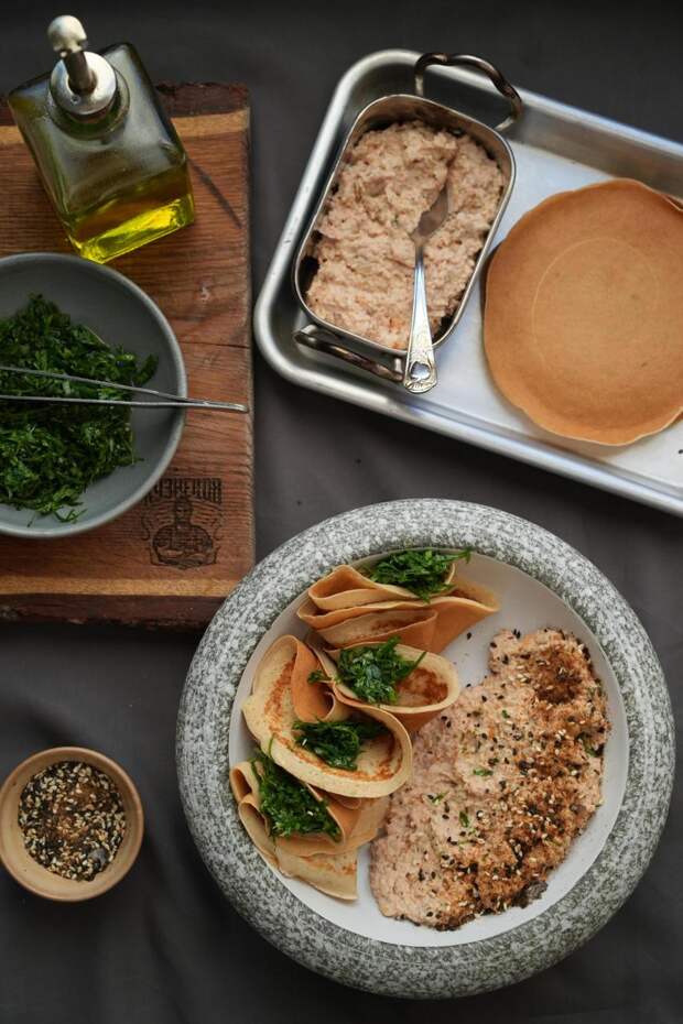 1. На одну сторону бойл-тарелки нанести риет из копченого лосося, а на другую сторону - сложить гармошкой блины. Декорировать их гремолатой и приправой «Фурикакэ».
