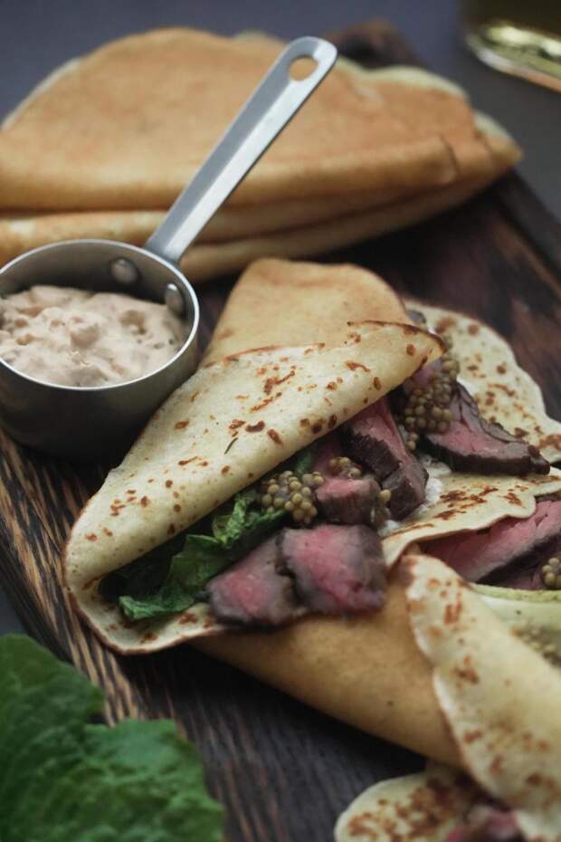 1. На хрустящий сырный тако блин нанести творожный сыр, выложить обжаренные листья Романо и ломтики стейка. Декорировать зерновой горчицей и черным молотым перцем.