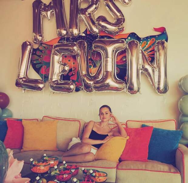 На одном из фото Селена сидит на диване, а за ее спиной развешаны шары с надписью «Миссис Левин», что намекает нам на то, что она собирается взять фамилию мужа. Само празднование проходило на мексиканском курорте Кабо-Сан-Лукас, куда приехали ее подруги.
