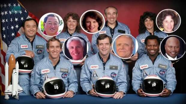 Экипаж STS-51L. Позади слева направо: Эллисон С. Онидзука, Шэрон Криста Маколифф, Грег Джарвис и Джуди Резник. Спереди слева направо: Майкл Дж. Смит, Дик Скоби и Рон Макнейр. Официальный портрет НАСА от 15 ноября 1985 года.