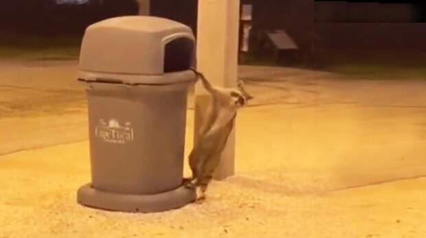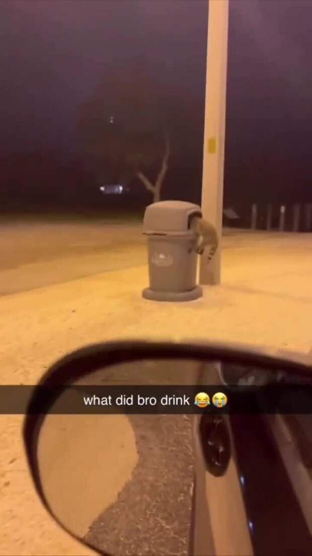 На видео енот вылезает из мусорного бака и, шатаясь, падая и подскакивая, идет в направлении леса — и правильно делает, в таком состоянии нужно срочно отправляться домой отсыпаться. Основным предположением пользователей стало то, что енот выпил недопитый людьми алкоголь, который кто-то оставил.