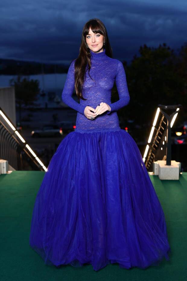 Звезда «50 оттенков серого» Дакота Джонсон появилась на Международном кинофестивале в Цюрихе в «голом» платье ультрамаринового оттенка от Gucci. Актриса отказалась от нижнего белья для этого выхода, и наряд эффектно продемонстрировал ее декольте и бедра.