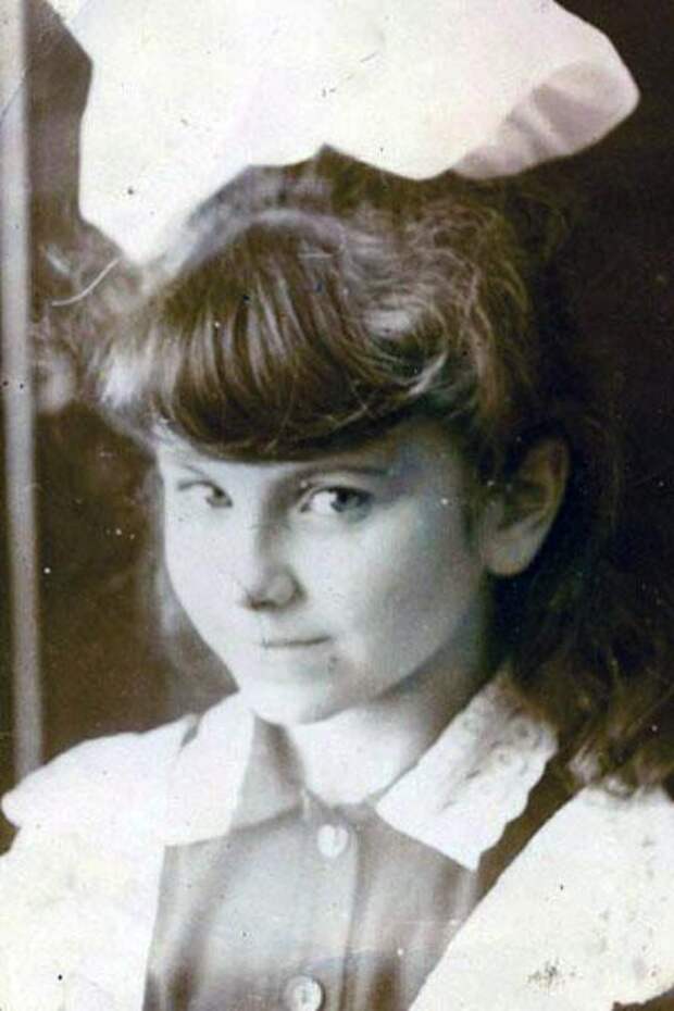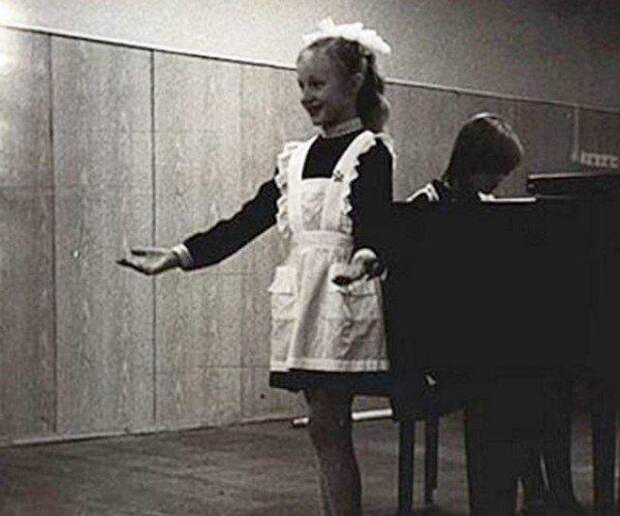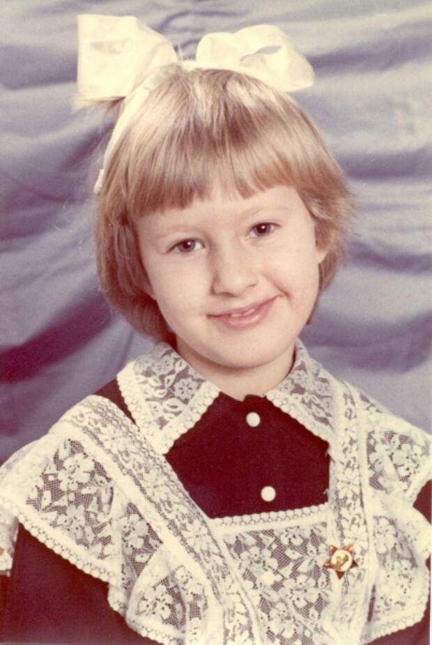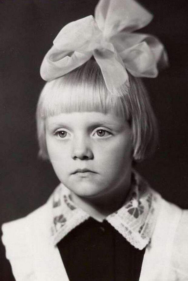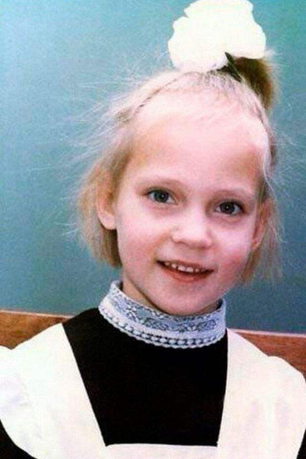 Но что мы все о мужчинах, давайте вспомним и о девушках. Вот эта красотка с милым бантом — певица Наталья Ионова, более известная как Глюкоза. Это сейчас она сидит тихая и скромная, но пройдет 5-7 лет — и она захочет показать всем, кто тут главный. Будущая певица в школе перекрасила волосы в синий цвет, а также сделала огромные ресницы.