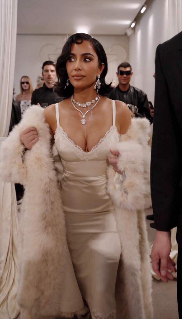 Бизнесвумен прошлась по подиуму на прощальном шоу для бывшего креативного директора бренда Balenciaga Демны Гвасалии, который перешел в Gucci. Ким дефилировала в шелковом платье-комбинации, длинной шубе и мощном ювелирном обвесе.