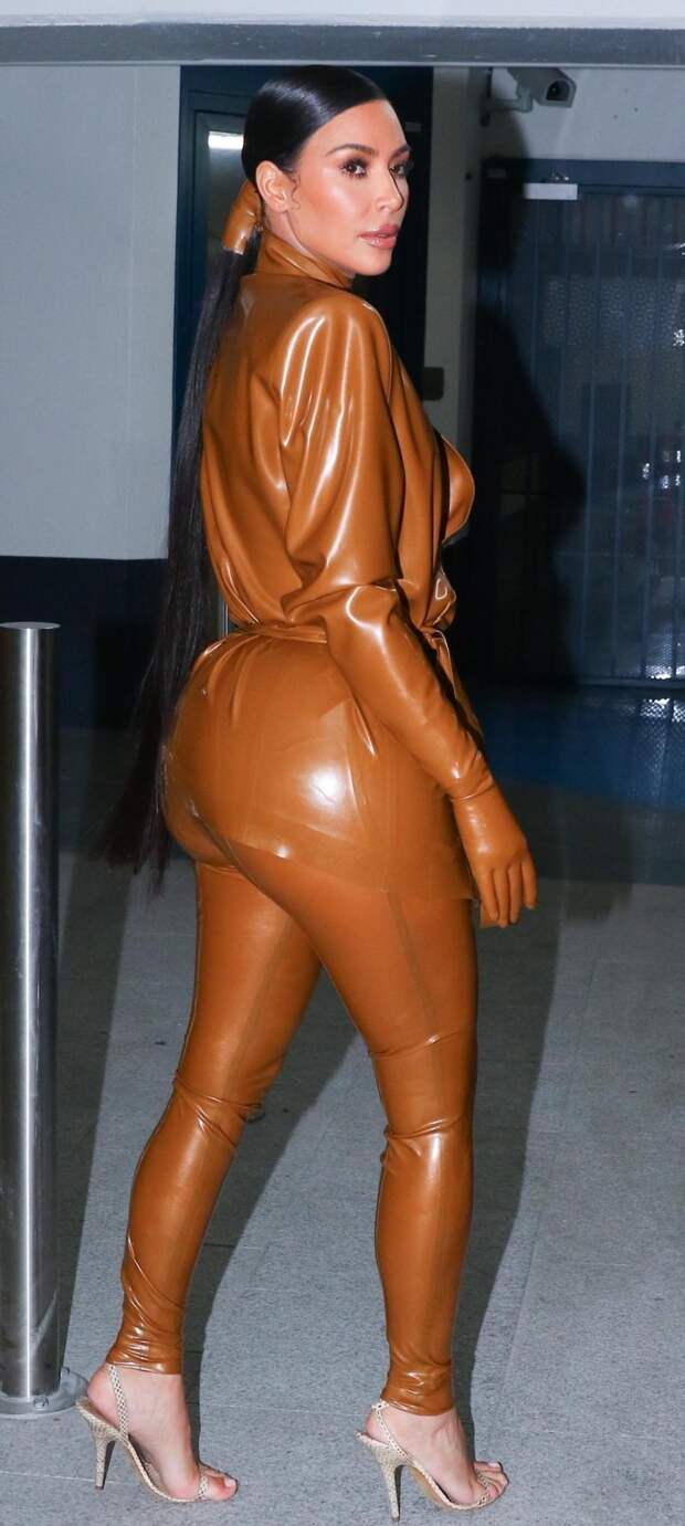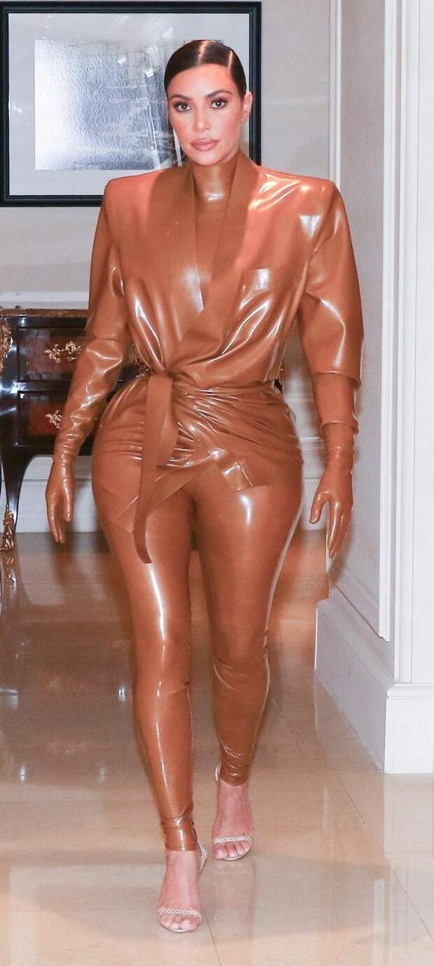 Парижскую Неделю моды в 2020-м Ким посетила в комплекте от Balmain из карамельного латекса. Звезде далеко не сразу удалось надеть на себя все элементы костюма: боди треснуло по шву на бедрах, но разрыв удалось спрятать под легинсами.