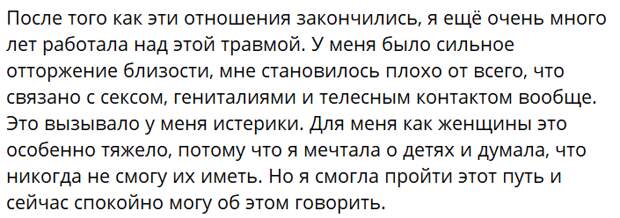 «Отдельно позабавило, как он написал, что я „истерила“ и „угрожала нанести себе вред“, когда он хотел расстаться. Но про себя почему-то ничего не сказал. Я неоднократно пыталась сбросить этот балласт и уйти, как он рыдал и умолял меня не бросать его, ведь у нас любовь».