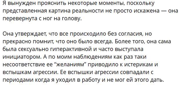 «Но в нашей ситуации всё было наоборот, это я неоднократно пытался уйти, а она меня не отпускала, используя шантаж и угрозы. Может она и была в зависимости от меня, но эта зависимость была построена на её нежелании меня отпускать».