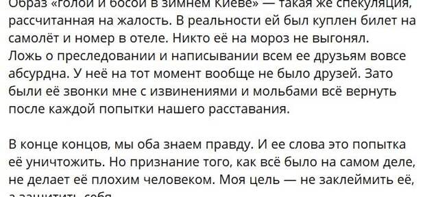 В тот же день что и Иван, Марияна в своем телеграм-канале объяснила, что страдала в этих отношениях, ведь ее психика была на грани из-за полученных травм, связанных с близостью и эмоциональным насилием.
