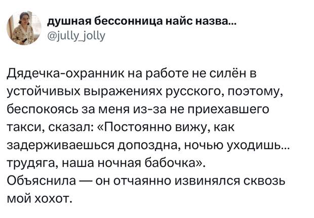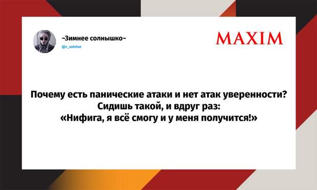 В России заблокирован «Твиттер» (теперь Х), но наш специальный корреспондент из-за рубежа присылает нам самые смешные твиты дня. А мы раз в неделю отбираем из них лучшие, бережно сохраняя авторские орфографию и пунктуацию.